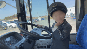 卒園児の【保育園での思い出】や、子どもたちが協力して描いた【桜の製作】をバス車内一面に掲示したオリジナルバス内を見学しました。