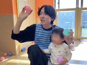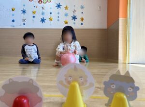 0・1歳児クラスでは、小さくて可愛らしい鬼を用意し、ボールで倒すボーリング遊びを行いました🎳「えいっ!」とボールを転がし、鬼が倒れるとにっこり😊鬼=怖い存在ではなく、「楽しい遊びの中の鬼」として感じられるような時間になりました。