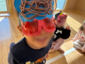 3歳児クラスでは、赤い鬼のサングラスを製作😎🔥かけた瞬間、背筋がピン!と伸びて「がおー!」とポーズを決める姿はとても微笑ましく、役になりきる楽しさを存分に味わっていました。