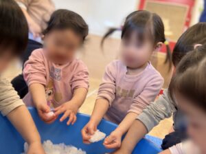 0.1.2歳児クラスでは安全に楽しめるよう、たらいに雪を入れて室内へ運びました。初めて目にする白いかたまりに、そっと指先で触れる子、恐る恐るつついてみる子、じっと見つめて様子をうかがう子など反応はさまざまでした👀