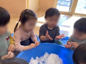 0.1.2歳児クラスでは安全に楽しめるよう、たらいに雪を入れて室内へ運びました。初めて目にする白いかたまりに、そっと指先で触れる子、恐る恐るつついてみる子、じっと見つめて様子をうかがう子など反応はさまざまでした👀