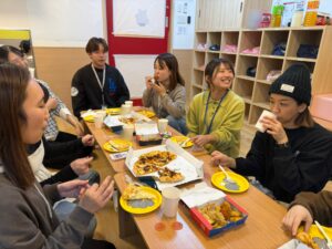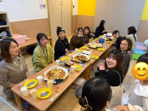 今回の歓迎会は園内で行いました!🏫ピザやポテト、スイーツなどを準備し、仕事終わりにみんなでご飯を囲みながら、自然と会話が弾む和やかな時間となりました🍕🍟🎂「みんなで集まれるのなかなかないから楽しいですよね〜」「前の職場はこんな感じじゃなかったから〜」とそんな声も聞こえてきました。