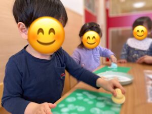【獅子舞製作】獅子舞の製作では、獅子舞の油単(ゆたん)の模様を、スポンジと絵の具を使って表現しました🎨最初はスポンジの感触や絵の具の付き方に戸惑い、そっと色をのせていた子どもたちですが、製作が進むにつれてどんどん大胆になり、最後には力強く、豪快に色を重ねる姿へと変わっていきました💪その様子は、まるで獅子舞の持つ迫力や力強さが、子どもたちの手を通して表れているようにも感じられました。一人ひとり違う模様が完成し、「これ、強そうでしょ?」と言わんばかりに自分の作品を誇らしげに見せてくれる姿がとても頼もしく感じられました✨また、獅子舞の形が出来ると『ガオーッ』と声を出して真似をしている様子の子がとても可愛らしく感じました😂