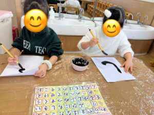 【習字遊び】普段の生活ではあまり扱うことがない習字遊びに挑戦しました!子どもたちに「自分の好きなひらがな」「得意なひらがな」を一文字選んでもらい、半紙に清書をしました🖌️いつも使っている鉛筆やクレヨンとは違い、筆は少し扱いが難しく、最初は「こうでいいのかな?」と戸惑いながら持つ姿も見られました。一画一画を確かめるように、丁寧にひらがなを書く子どもたちの表情はとても真剣で、書き終えたあとはぱっと笑顔に変わっていました😊「『か』って書けたよ!」「ママの名前に入ってるから、これにした!」「アイスが好きだから『あ』!」など、子どもたちからは嬉しそうな声がたくさん聞こえてきました🍦それぞれが選んだひらがなには、ちゃんと理由があり、自分で選んだ一文字だからこそ、より大切そうに、そして誇らしそうに紹介してくれる姿がとても可愛らしかったです💕